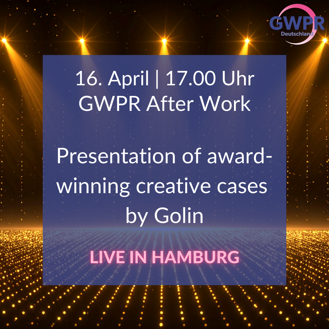 Liebe GWPR-Mitglieder, wir freuen uns sehr über die Einladung von unserem langjährigen GWPR-Mitglied Anja Guckenberger (Managing Director Golin) zu unserem nächsten After Work Treffen bei Golin in Hamburg. Dieses Mal mit einem besonderen Creative-Fokus: „Creating the best work of our lives (selection of award-winning creative cases by Golin)” George Bryant, Global Chief Creative Officer (CCO)