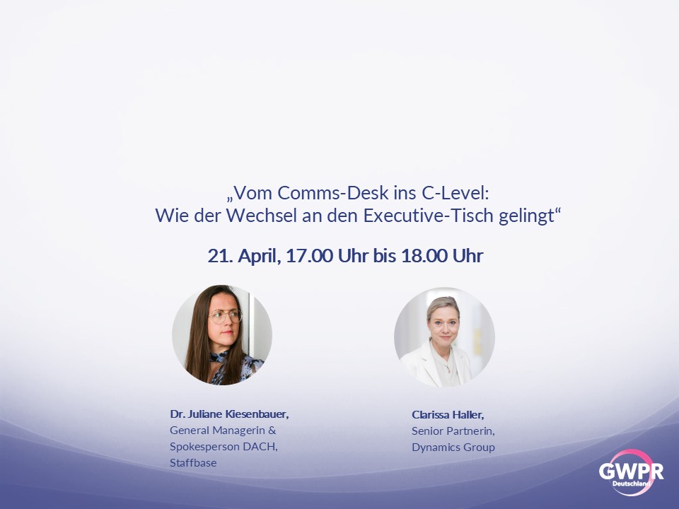 Liebe Mitglieder und Unterstützerinnen von GWPR Deutschland e.V., viele von uns kennen den Moment, in dem die Frage drängender wird: Wie gelingt der nächste Schritt - und welcher ist der richtige? Und wäre auch der Wechsel ins General Management eine Option? In unserem digitalen Fireside Chat spricht Clarissa Haller mit Dr. Juliane Kiesenbauer, General Manager